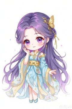 This is a digital cartoon-style illustration featuring a young girl with long and flowing purple hair, wearing a golden butterfly hairpin on her head. Her large and expressive purple eyes complement her small and delicate nose as well as her gentle smile. She is dressed in a delicate blue and gold checkered kimono with floral patterns and a bow decoration on the chest. Her right hand rests on her cheek, and her left hand is slightly extended. The background is pure white, adding a dreamy atmosphere. The overall style is cute and full of fantastical colors, emphasizing bright colors and exquisite details.