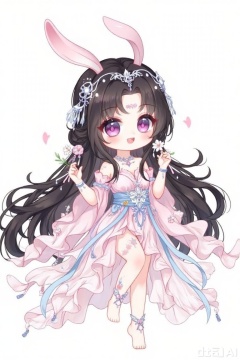this is a digital anime-style illustration of a chibi girl with large, expressive purple eyes and long, flowing black hair adorned with pink bunny ears and intricate white and pink hair accessories, she is wearing a delicate, semi-transparent pink and blue dress with floral patterns and ribbons, and is barefoot, the dress has a flowing, layered design with sheer, ruffled fabric, she holds a small white flower in her right hand, and her left hand is raised near her face, the background is plain white, making the character the focal point, the overall style is cute and whimsical, with soft pastel colors and detailed, delicate textures