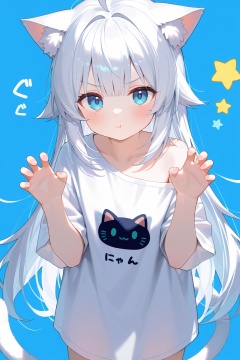 1girl,solo,long hair,looking at viewer,blush,bangs,blue eyes,simple background,shirt,animal ears,very long hair,closed mouth,tail,white shirt,ahoge,white hair,short sleeves,cat ears,off shoulder,star \(symbol\),v-shaped eyebrows,cat tail,animal ear fluff,hands up,blue background,cat girl,!,:t,pout,claw pose,!!,oversized shirt,