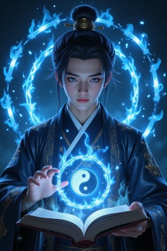 CGI,a young handsome Taoist casting glowing blue magic spell, a opened magic book is in front of him, summoning glowing blue magic circles around him, glowing blue magic effects, glowing yin and yang symbol, dark blue background, particle effects, highly detailed, ultra-high resolutions, 32K UHD, best quality, masterpiece,