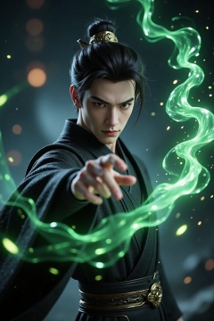 CGI,an extremely handsome young man wearing black robe,using magic power,(casting glowing Chinese magic spell:0.7),(glowing green Chinese texts:0.8),VFX,(glowing energy fluid:0.8),special effects,(glowing energy effects:0.8),(glowing green magic effects:0.8),dynamic movements,highly detailed,32K UHD,best quality,masterpiece,close-up,upper_body,game cg,Cinematic Lighting,reality,realistic,boy,