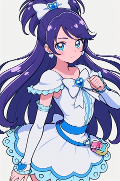 masterpiece,best quality, highly detailed, cure white,magical girl,1girl,solo,white dress,detached sleeves,looking at viewer,heart earrings,white bow,half updo<lora:cure_white:1>,simple background,white background
