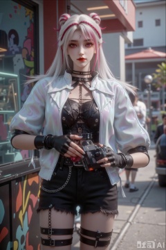 Super realistic and beautiful romantic illustrations, rich details showing exquisiteness, she stood in front of a fashionable street art wall full of vibrant murals, one hand in her pocket and the other holding a disposable camera. Her body leaned slightly backward, her hips raised to one side, and she had a calm and confident expression on her face as she posed for the filming. The background is the bustling city street view: a trendy brand store behind her is a graffiti-covered street clothing store with the latest designer collaborations displayed in the window. Other fashionable and avant-garde pedestrians walked by, and there was a food truck selling fashionable snacks on the side of the road. The air is filled with street music and the sound of chatter, and the bright sunlight makes her costume and the colors of the art around her vividly pop in the photos.