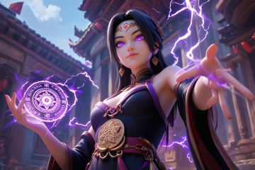 Dark style,score_9,score_8_up,score_7_up,(masterpiece),(highest quality),highres,(extremely detailed),High quality texture,incredibly absurdres,Dark style,ancient style beauty,long black hair,purple eyes,purple gilded black lotus,black dress,cleavage,upper_body,dark magic,(surrounded by purple electricity),glowing eyes,from_below,reaching right hand,(a balck lotus floating on the hand),(emitting a faint purple glow),serious,kubrick_stare,magic circles,chinese style architecture,glowing forehead mark of lotus,evil smile,