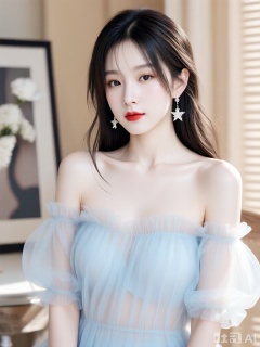 solo,1girl,Photograph of an Asian woman with fair skin and long, dark brown hair, styled in loose waves. She has a slender build with a small to medium bust size. She is wearing a light blue, off-the-shoulder, chiffon dress with puffed sleeves and a ruffled neckline. Her lips are painted a vibrant red, and she wears star-shaped, silver earrings. She is looking directly at the camera with a calm expression. The background includes a blurred photograph on a table, white flowers in a vase, and vertical blinds. The lighting is soft, creating a gentle, serene atmosphere. The overall style is elegant and delicate.