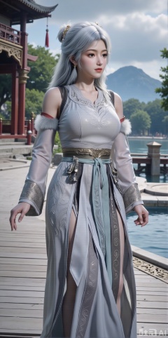 (masterpiece, best quality:1.2),1 girl, solo, long hair, hair accessories, clothing, long dress, jewelry, upper body, earrings. Background is outdoor, sky, clouds, water, trees, architecture, landscape, lantern, mountain, dragon, architecture, bridge, east Asian architecture, fog, pagoda,,(huge breasts:2.99),(full breasts:2.99),XyunxiaoYH3,,XbaifengsongyuYH,Xbigbreasts,Xxuenvxuedi,XyanqingfeiX,Xloubeidress,XyinyueX3