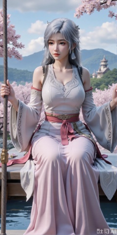(masterpiece, top quality, best quality, official art, beautiful and aesthetic:1.2),Dynamic posture,(Sitting on the swing:1.39),natural skin texture,(Milky skin:1.2),1gir,solo,long Dress, (Long legs, perfect proportions:1.2),(Sakura, butterfly:1.29),(huge breasts:2.99),(full breasts:2.99),Wisteria, wisteria flowers, castle, waterfall, mountains in the distance,,XyunxiaoYH3,,XbaifengsongyuYH,Xbigbreasts,Xxuenvxuedi,XyanqingfeiX,Xloubeidress,XyinyueX3