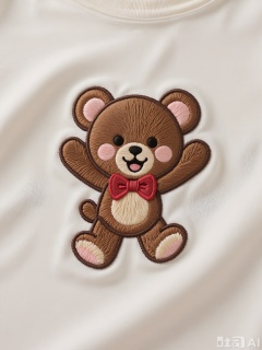 CXTA, A cute, embroidered design of a plush teddy bear with a joyful expression. The bear is brown with a red bow tie, black button eyes, and a stitched smile. The background is a soft beige, and the overall style is whimsical and charming.