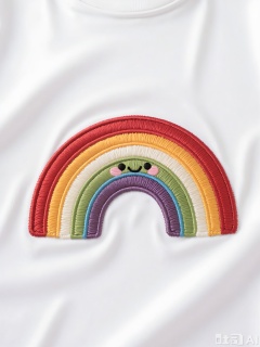 CXTA, A cute, embroidered artwork of a colorful rainbow with a smiling face. The rainbow has seven vibrant stripes, and its face features black eyes, a curved mouth, and pink blush. The background is white, giving it a fresh and lively look.