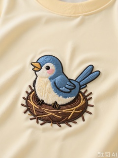 CXTA, A cute, embroidered artwork of a little bird sitting on a nest. The bird is blue with a yellow beak, black eyes, and a contented smile. The nest is brown, and the background is a soft yellow, creating a warm and cozy scene.