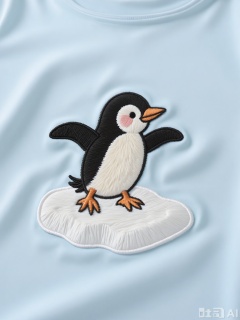 CXTA, A cute, embroidered artwork of a little penguin waddling on ice. The penguin is black and white with black eyes, an orange beak, and a cheerful expression. The ice is white, and the background is a light blue, creating a chilly but cute scene.