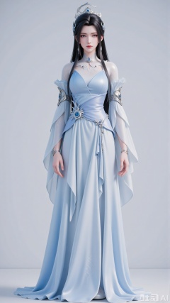 A female character in ancient fantasy and immortal style, wearing a light - blue gradient long dress with a cinched waist. She is matched with an exquisite silver hair crown, necklace, and arm ornaments. She has tulle sleeves, and her long black hair is adorned with simple hair accessories. With a cold and serene makeup look, a mark on the forehead, and deep - blue eyes, she is presented against a simple light - gray background, with a quiet and elegant posture.,3d_character_lxq