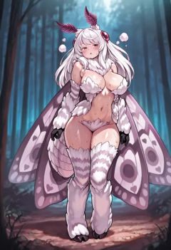 masterpiece, best quality, amazing quality, absurdres, perfect face, solo, vibrant, depth of field,1girl, 20yo, large breasts,mothmanmge, fur clothing, monster girl, arthropod girl, navel, red eyes, large breasts, red antennae, white hair, long hair, animal hands, cleavage, light purple fur, striped thighhighs, hooves, insect wings, moth wings, moth antennae, moth girl, large wings, fluffy, chest tuft, mane, striped sleeves, fur thighhighs, fur sleeves, detached sleeves, bare shoulders, fur bridal gauntlets, fur boots, animal feet, thighhighs under boots, cotton balls, multicolored wings, pink wings, purple wings, arthropod tail, eye hair ornament, black hands, fewer digits, bangs,blush, sweat, breath, full body,looking at viewer, detailed background, dark background, forest,<lora:StS-Illustrious-Detail-Slider-v1.0:3> <lora:Dynamic lighting[IL]:0.6> <lora:illustrious_quality_modifiers_masterpieces_v1:0.5> <lora:mothmanmge-000007:0.9>