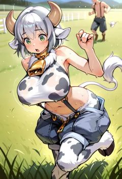 masterpiece, absurdres, best quality, ultra-detailed, newest, best quality, amazing quality, very aesthetic, depth of field,1girl, 20yo, large breasts,holstaurmge, animal ears, zipper, green eyes, streaked hair, neck fur, cow girl, animal legs, dark grey hair, monster girl, neck bell, cow print, cow print top, multicolored hair, cow ears, short hair, large breasts, cow tail, cowbell, navel, collar, two-tone hair, hooves, bare shoulders, white hair, unzipped, suspenders, cow horns, taut shirt, midriff, baggy shorts, blush, sweat, full body, loose clothes, standing, clumsy, tripping,looking at viewer, detailed background, grass, meadow,<lora:StS-Illustrious-Detail-Slider-v1.0:3> <lora:illustrious_quality_modifiers_masterpieces_v1:0.5><lora:Dramatic Lighting Slider:3> <lora:holstaurmge-000007:0.8>