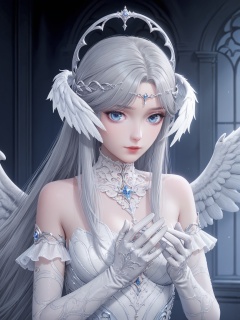 score_10,score_9,score_8_up,score_7_up,1girl,wings,solo,head wings,gloves,long hair,white gloves,dress,breasts,holding,upper body,looking at viewer,jewelry,medium breasts,melia antiqua,blue eyes,grey hair,bare shoulders,