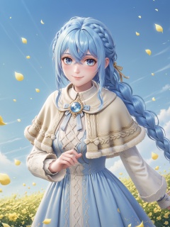 score_10,score_9,score_8_up,score_7_up,1girl,roxy migurdia,blue eyes,solo,long hair,blue hair,smile,looking at viewer,braid,hair between eyes,closed mouth,dress,blush,crossed bangs,capelet,petals,long sleeves,