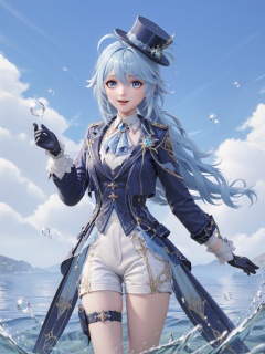 score_10,score_9,score_8_up,score_7_up,1girl,furina (genshin impact),gloves,top hat,hat,white gloves,mismatched gloves,asymmetrical gloves,blue eyes,white shorts,blue jacket,blue hair,shorts,solo,smile,blue headwear,looking at viewer,heterochromia,long hair,black gloves,jacket,open mouth,ascot,outdoors,ahoge,sky,bubble,light blue hair,multicolored hair,long sleeves,blue ascot,thigh strap,water,blue sky,hair between eyes,blue brooch,cloud,gem,