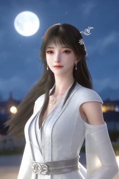 <lora:新神墓-雨馨Pony:0.7>,1girl,long,straight black hair,silver hairpin,flowing,ethereal white robe with intricate,silver embroidery,V-neck,silver belt,long sleeves,1girl,solo,shiny,shiny_hair,upper_body,fair_skin,white_skin,shiny_skin,shiny,Ivory_skin,looking at viewer,cinematic lighting,volumetric lighting,solo focus,blurry background,depth of field,night,sky,night sky,full moon,moonlight,