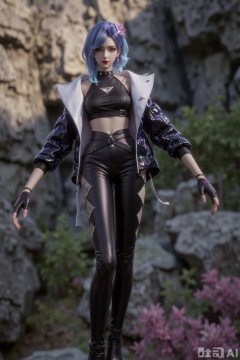 The image depicts a character with striking blue hair styled in a modern, edgy fashion. The character is wearing a black outfit with a futuristic design, including a sleeveless top, a jacket with intricate patterns, and high-waisted pants with cut-out details. The character also wears fingerless gloves and boots, adding to the overall stylish and dynamic appearance. The background consists of a natural setting with rocky terrain and greenery, suggesting an outdoor environment. The character's pose is confident and dynamic, with arms extended and legs slightly bent, as if in motion or ready for action.
