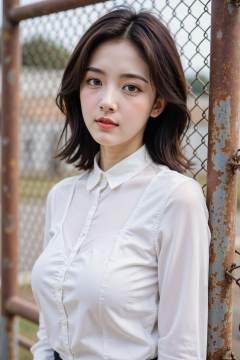 <lora:20250818_AgainGirlF1Lora10:0.8>,Vibrant colors infused with mixed colorism,soft_light_style,In the image,a young woman is the central figure, black and brown eyes,standing against a backdrop of a chain link fence. She is dressed in a white blouse,and she is wearing short skirt, large breasts and smile, The fence behind her is rusted,suggesting it has been exposed to the elements for some time. The woman is looking directly at the camera,her expression neutral. The image is taken from a slightly elevated angle,providing a clear view of the woman and the fence.,