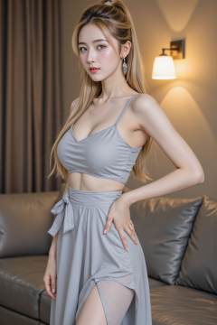 <lora:20250818_AgainGirlF1Lora10:0.8>,A young and beautiful Asian woman with long blonde hair tied high into a ponytail and blue eyes, hair supple and shiny, shining healthily in the light. She wears a pair of exquisite long silver earrings with a unique design that shines in the light and shakes gently with her movements. Delicate makeup, picturesque eyebrows, as if hiding the stars of the sea, lips painted with light pink lipstick, appears gentle and moving. The facial outline is three-dimensional, the apple muscle is full, the bridge of the nose is high and the lines are smooth. She was wearing a light gray one-shoulder dress with a light material and subtle transparency, showing a looming sense of beauty. The transparency of the shoulder and skirt is slightly higher, and the texture of the skin can be clearly seen, while the key parts such as chest and waist are less transparent and skillfully maintained. The skirt has a natural and smooth fold design, the folds at the single shoulder hang down like a waterfall, and the folds at the skirt spread slightly with the posture of the body, as if the breeze blows and fits the curve of the body, outlining her graceful posture, the figure proportion is perfect, the golden ratio of the nine-headed body, the legs are long and straight. The background is a modern indoor scene, the gray sofa has a delicate leather texture, the surface is smooth, the stitches are neat, and the back and cushions of the sofa look very comfortable. The light next to it is warm yellow, soft and uniform, emitting from the wall lamp next to the sofa, casting a touch of light and shadow on the wall and ground, creating a warm and romantic atmosphere. The character stands sideways, one hand gracefully on his waist, confident and generous. The whole picture creates a stylish, elegant and slightly mysterious atmosphere, as if telling a wonderful story about urban women. The picture style tends to be the combination of realism and fashion, which not only has the texture of real characters and scenes, but also has the exquisite sense of fashion magazines. Do you think this revision is in line with your expectations? If you have any other ideas, you are welcome to continue to communicate with me.