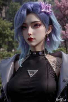 The image depicts a character with short, wavy hair that transitions from light blue at the roots to a darker shade at the tips. The character has striking red eyes and is wearing a black outfit with a high collar adorned with purple gem-like studs. They are also wearing a futuristic-looking jacket with metallic accents. The character has a visible tattoo on their left arm, which appears to be a swirling design. In the background, there is an outdoor setting with blurred greenery, suggesting a park or garden area.