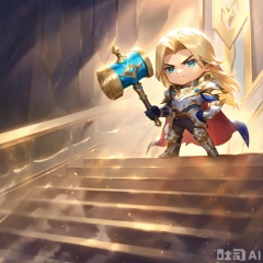 solo, long hair, blonde hair, gloves, 1boy, weapon, male focus, boots, cape, armor, stairs, armored boots, hammer,Chibi Spirit