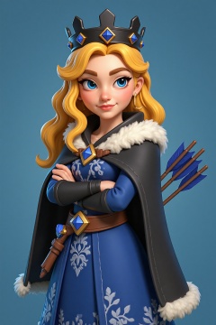 3D,A girl with golden curly hair,wearing a black crown studded with sapphire. Her eyes are bright blue and confident,her arms crossed confidently over her chest.,She wears a blue dress adorned with delicate patterns,tied around the waist with a brown belt,in the center of which is set a blue diamond-shaped gemstone. She drapes herself in a black cloak,the edges of which are trimmed with white fur,exuding an aura of grandeur and magnificence.,On her back,she carries a quiver containing several arrows with blue arrowheads,hinting at her proficiency in archery,. set against a solid blue background.,