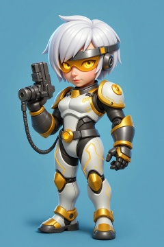 3d,A digital illustration of a chibi-style character with short white hair,gold eyes,and a robotic left arm. The character wears a futuristic,white and gold jumpsuit with glowing circuit patterns and a visor over their eyes,holding a high-tech blaster. Their expression is cool and collected. The style is reminiscent of cyberpunk anime and android character concepts.,set against a solid blue background.,