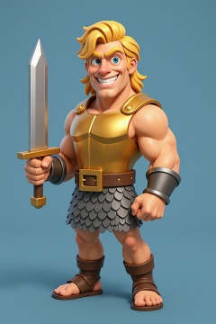 3D,This is a digital illustration featuring a muscular, golden-haired man with a confident expression. He has a fair complexion and a broad, strong build. The man is depicted in a classic warrior attire, wearing a golden, metallic chestplate that covers his torso, leaving his shoulders and upper arms exposed. His left arm is flexed, showing off his biceps, while his right arm holds a large, double-edged sword with a shiny silver blade and a golden hilt. He also sports a brown leather belt with a square buckle, and a grey, scale-like armor skirt that covers his lower body. The man's facial features are exaggerated, with large, expressive eyes and a wide, toothy grin. His hair is styled in a wild, tousled manner that frames his face. The background is a solid, medium blue color, making the character stand out prominently. The illustration style is reminiscent of modern 3D animation, with a polished, cartoonish aesthetic and smooth shading. The character's pose and expression convey a sense of strength and readiness for battle.. set against a solid blue background.,