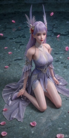 They are dressed in a flowing, outfit that appears to be made of delicate fabric, with intricate designs and patterns. The character is surrounded by floating pink petals, enhancing the dreamy and magical atmosphere. The background consists of a body of water, which reflects the soft colors of the scene, further emphasizing the tranquil and mystical setting.,linziyue,purple_hair