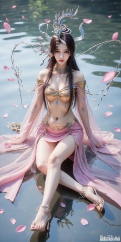 They are dressed in a flowing, outfit that appears to be made of delicate fabric, with intricate designs and patterns. The character is surrounded by floating pink petals, enhancing the dreamy and magical atmosphere. The background consists of a body of water, which reflects the soft colors of the scene, further emphasizing the tranquil and mystical setting.,yunwangshu,,hair ornament,