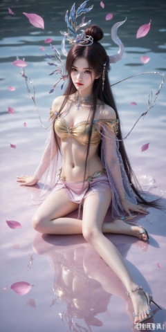 They are dressed in a flowing, outfit that appears to be made of delicate fabric, with intricate designs and patterns. The character is surrounded by floating pink petals, enhancing the dreamy and magical atmosphere. The background consists of a body of water, which reflects the soft colors of the scene, further emphasizing the tranquil and mystical setting.,yunwangshu,,hair ornament,