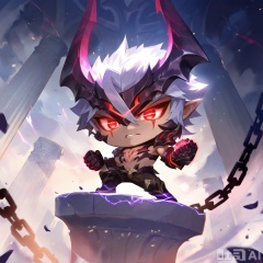 solo, red eyes, 1boy, white hair, male focus, horns, armor, glowing, chain, shoulder armor, clenched hand, glowing eyes, pauldrons, pillar,Chibi Spirit