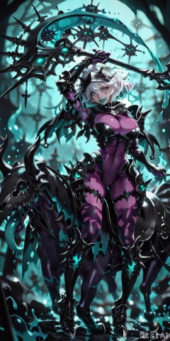 masterpiece, full body. absurdres, best quality, ultra-detailed, newest, best quality, amazing quality, very aesthetic, depth of field,hyper detailed, (dynamic pose:1.4),masterpiece, best quality, amazing quality, absurdres, perfect face, solo, vibrant, depth of field,paleridermge,,paleridermge, undead, pink skin,black sclera, teal eyes,teal fire, dripping liquid,horns, tongue out, virus,white hair,short hair, black armor,armored boots, black gauntlets,revealing armor, purple bodysuit,impossible bodysuit, impossible clothes,spikes, bone armor, high heel boots,shoulder armor, torn clothes,cleavage.dark purpie horse,horseback riding, black barding.,black saddle, large scythe,holding scythe.skull headpiece,black headpiece, skull neck accessory,black tattoos, arm tattoo, leg tattoo,torn capelet, multicolored capelet,black cape let.