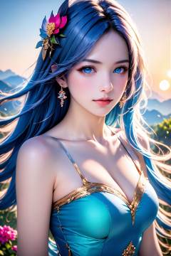 <lora:20250818_AgainAnimeGirlLora9:1>, 1girl, solo, jewelry, petals, earrings, hair ornament, long hair, looking at viewer, falling petals, blurry background, outdoors, upper body, blue hair, closed mouth, blurry, mountain, sky, portrait, dress, clothing cutout, realistic, blue eyes, sun, blue sky, flower, cleavage cutout, collarbone, grey eyes