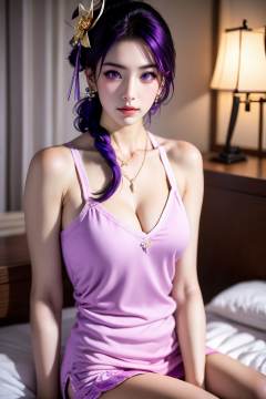 <lora:20250818_AgainAnimeGirlLora9:1>, 1girl, jewelry, raiden shogun, breasts, mole under eye, mole, indoors, solo, hair ornament, necklace, braid, flower, long hair, sitting, blurry, earrings, cleavage, purple hair, purple eyes, looking at viewer, on bed, window, blurry background, lamp, bedroom, bed, shorts, curtains, white camisole, hair flower, nose, lips, braided ponytail, realistic