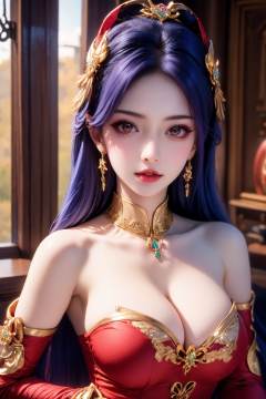 <lora:20250818_AgainAnimeGirlLora9:1>, 1girl, jewelry, breasts, dress, solo, blue hair, long hair, building, earrings, red dress, cleavage, brown eyes, parted lips, looking at viewer, hair ornament, butterfly, detached sleeves, bug, upper body