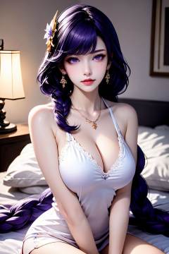 <lora:20250818_AgainAnimeGirlLora9:1>, 1girl, solo, long hair, breasts, looking at viewer, bangs, large breasts, hair ornament, dress, cleavage, bare shoulders, jewelry, sitting, very long hair, closed mouth, purple eyes, collarbone, purple hair, braid, flower, thighs, earrings, sleeveless, indoors, necklace, white dress, mole, lips, pillow, mole under eye, window, bed, on bed, between legs, v arms, braided ponytail, hand between legs, spaghetti strap, lamp, raiden shogun