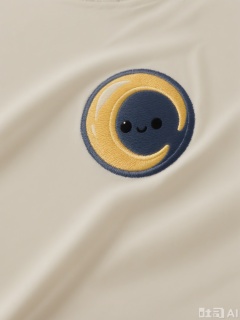 CXTA, A cute, embroidered pattern of a smiling moon with a crescent shape. The moon is yellow with black eyes, a curved mouth, and a few stars around it. The background is a dark blue night sky, making it dreamy and whimsical.