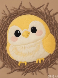 CXTA, A cute, embroidered artwork of a little bird sitting on a nest. The bird is blue with a yellow beak, black eyes, and a contented smile. The nest is brown, and the background is a soft yellow, creating a warm and cozy scene.