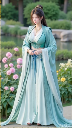 (masterpiece:1.2),best quality,,A woman adorned in traditional Chinese attire,featuring a flowing robe with intricate embroidery and floral accents. A garden filled with pink roses and lush greenery. Soft pastel hues of white,blue,and green,creating a serene atmosphere. Photorealistic photography.,Xaili2,XyunxiaoYH5,XlinziyueXZ,XtuliH,Xbigbreasts,XMedusaQueen,Xnanhangzhifu,Xjkgeziqun,Xbingbing,XmupeulingHY3,XhanliYY