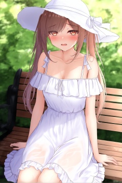 Monaka Curl, 1girl, breasts, solo, dress, hat, brown hair, white dress, cleavage, sitting, bench, collarbone, blush, looking at viewer, white headwear, open mouth, wet, long hair, sun hat, brown eyes, wet clothes, see-through, twintails, ribbon, bare shoulders, medium breasts, bow, outdoors, on bench, hat ribbon, frilled dress, sidelocks