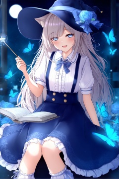 Monaka Curl,1girl,witch hat,hat,solo,book,smile,shirt,skirt,white shirt,long hair,short sleeves,puffy sleeves,butterfly,bug,holding,wand,bow,blue bow,:d,frills,puffy short sleeves,frilled skirt,flower,holding wand,very long hair,blush,socks,suspenders,blue skirt,blue flower,suspender skirt,rose,sitting,looking at viewer,collared shirt,hat flower,night,animal ears,grey hair,one side up,moon,feet out of frame,blue rose,center frills,star \(symbol\),full moon,black headwear,frilled socks,open book,star \(sky\),window,hat bow,white socks,blue butterfly,open mouth,night sky,witch,starry sky,