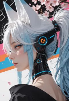 mature woman,(cyber-doll, cyber-body accents),fox ears, choker, kimono, cherry blossoms,skin pressed, black dress, blue lashes, long lashes, very awa, multicolored background, black inked, zigzag_background, white,white hair, blue hair, messy hair, ponytail, long hair, bangs, long bangs, orange eyes,portrait, profile, back view, tilted angle, close up, upper body with face focus, from below,looking at viewer, tilted head, blush, leer,(neon)