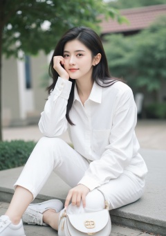 short hair,1girl,solo,black short hair,white pants,white footwear,bag,pants,sitting,(looking at viewer:1.2),piercing,shirt,jewelry,shoes,white shirt,full body,shoulder bag,long sleeves,ear piercing,smile,outdoors,hand on own face,black eyes,handbag,closed mouth,lips,long hair,collared shirt,white jacket,
