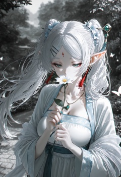perspective,fisheye lens,blurry,photo background,1girl,solo,sousou no frieren,frieren,earrings,chromatic aberration,messy hair,elf,pointy ears,twintails,white hair,white shirt,fashion,cool girl,pose,holding flower,good hands,scenery,outdoors,nature,leaf,wind,tassel,blunt bangs,large breasts,nail polish,covered mouth,tassel earrings,jewelry,hair flower,hairclip,long sleeves,hair stick,collarbone,pale skin,gem,facial mark,forehead mark,necklace,tattoo,shawl,neck tattoo,outdoors,(blurry background:1.21),(hanfu:1.61051),(chinese clothes:1.21),(eyeliner, makeup:1.331),butterfly,garden,falling,((artist:betabeet)),artist:john_kafka,artist:nixeu,artist:quasarcake,masterpiece,best quality,solo,monochrome,spot color,very awa,masterpiece,best quality,year 2024,newest,highres,absurdres,