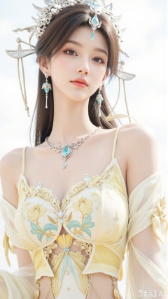 1girl, ((extremely detailed CG)), ((8k wallpaper)), solo, long hair, (looking at viewer:1.2), (sweet smile), (flat illustration), hair ornament, dress, jewelry, upper body, necklace, earrings,  lemon chiffon and cream print silk dress, white background, (flat color:1.2), flat light, (Medium Full Shot), from head to hip, Frontal View, eye level view, large bresats
