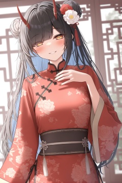 Monaka Curl,Cool, Cute, 1girl, solo, hair ornament, long hair, flower, black hair, looking at viewer, hair flower, chinese clothes, horns, smile, long sleeves, dress, white flower, wide sleeves, red dress, sash, red nails, upper body, hand up, colored inner hair, red flower, blush, blue hair, parted lips, china dress, nail polish, floral print, hair bun