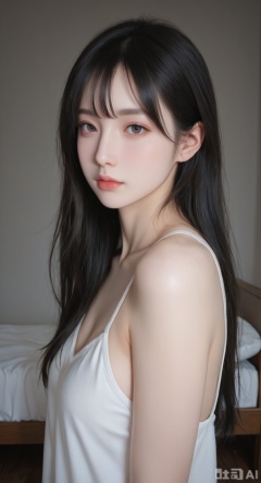 1girl, solo, long hair, looking at viewer, black hair, standing. upper body.bed room,